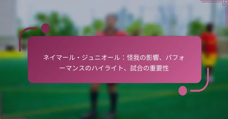 ネイマール・ジュニオールのキャリアは、パフォーマンスや試合のフィットネスに影響を与える怪我によって大きく形作られており、しばしば長期の回復時間を伴います。これらの課題にもかかわらず、彼は常に印象的な統計と重要な貢献を示し、際立った選手としての役割を確固たるものにしています。試合における彼の存在は重要であり、ゲームの結果に影響を与え、重要な瞬間にチームのパフォーマンスを引き上げる独自の能力を持っています。 ネイマール・ジュニオールの怪我がパフォーマンスに与える影響は? ネイマール・ジュニオールの怪我は、彼のパフォーマンスや試合のフィットネスに大きな影響を与え、しばしば回復期間が延び、フィールドでの貢献にも影響を及ぼします。これらの怪我は、彼の身体的能力を妨げるだけでなく、全体的なゲームに影響を与える心理的な影響もあります。 ネイマール・ジュニオールに影響を与える怪我の種類 ネイマール・ジュニオールはキャリアを通じてさまざまな種類の怪我に直面しており、それが彼の出場時間やパフォーマンスに影響を与えています。最も一般的な怪我には以下が含まれます: 特に足首や膝の捻挫や筋肉の損傷。 ハムストリングや太ももに関連する筋肉の怪我。 足の中足骨の骨折。 回復に長時間を要する軟部組織の怪我。 最近の怪我の重症度と回復期間 ネイマールの怪我の重症度はさまざまで、一部は数週間の回復を要する一方で、他は数ヶ月かかることもあります。最近の怪我では、軽度の捻挫の場合は通常3〜6週間の回復期間が必要で、より重度の筋肉の断裂や骨折の場合は数ヶ月かかることが示されています。 例えば、中足骨の骨折は約3ヶ月の回復期間を必要とすることがありますが、軽度の足首の捻挫であれば2〜4週間以内に復帰できる可能性があります。回復プロセスには、リハビリテーション、理学療法、トレーニングへの段階的な再統合が含まれることが多いです。 ネイマール・ジュニオールの怪我の歴史的背景 ネイマールの怪我の歴史は注目に値し、重要な試合やトーナメント中にいくつかの主要な怪我が発生しています。彼の最も重要な怪我は、FIFAワールドカップやUEFAチャンピオンズリーグの試合など、キャリアの重要な瞬間と重なることが多いです。 歴史的に見ても、ネイマールは重要な局面で彼を欠場させる怪我に直面しており、彼の耐久性に対する懸念が高まっています。このパターンは、怪我の可能性を高める高リスクの動きを伴う彼のプレースタイルについての議論を引き起こしています。 怪我が試合のフィットネスとパフォーマンスに与える影響 怪我はネイマールの試合のフィットネスに直接的な影響を与え、復帰時にはパフォーマンスレベルが低下することがよくあります。怪我から回復する際、選手はスピード、敏捷性、全体的な身体状態が低下することがあり、フィールドでの効果に影響を与える可能性があります。 さらに、怪我から復帰する際の心理的な影響は、プレーに対するためらいを引き起こし、パフォーマンスにさらに影響を与えることがあります。ネイマールのレジリエンスは称賛に値しますが、怪我後の調整期間は試合中の貢献が顕著に低下する結果をもたらすことがあります。 怪我前後のパフォーマンスの比較 ネイマールの怪我前後のパフォーマンスを比較すると、主要な指標において顕著な違いが見られます。以下の表は、これらのパフォーマンス指標のいくつかをまとめたものです: パフォーマンス指標 怪我前 怪我後 試合あたりのゴール数 0.5 - 0.7 0.3 - 0.5 試合あたりのアシスト数 0.4 - 0.6 0.2 ....