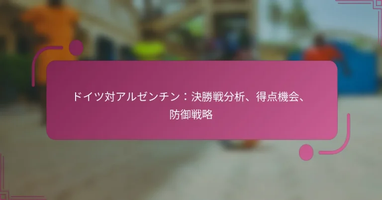 ドイツとアルゼンチンの決勝戦は、戦略とスキルのスリリングな対決を披露し、最終的な結果を決定づける重要な瞬間がありました。両チームは得点機会に対して独自のアプローチを示し、ドイツは迅速なトランジションを強調し、アルゼンチンはウィングプレイを活用しました。さらに、彼らの守備戦術も重要な役割を果たし、ドイツは構造化されたフォーメーションを維持し、アルゼンチンは相手に挑戦するために攻撃的なプレススタイルを採用しました。 ドイツ対アルゼンチンの決勝戦での重要な瞬間は何でしたか? ドイツとアルゼンチンの決勝戦は、結果を形作るいくつかの重要な瞬間によって特徴づけられました。重要なゴール、クリティカルなセーブ、物議を醸す審判の決定が重要な役割を果たし、選手の際立ったパフォーマンスとファンの関与が試合の緊張感を高めました。 試合の進行とタイムラインの概要 試合は両チームが戦術的な腕前を披露する形で展開されました。アルゼンチンは早い段階でリードを奪い、ドイツの守備の隙を突きました。しかし、ドイツは一連の攻撃を仕掛け、前半終了前に同点に追いつきました。 後半は緊張感が高まり、両チームが得点機会を生み出しました。ドイツの重要なゴールが流れを変え、アルゼンチンが同点を目指して戦う緊迫した最終局面に突入しました。試合はドイツがリードを守り、チャンピオンシップを獲得して終了しました。 結果に影響を与えた重要なプレー アルゼンチンの先制ゴールは、ドイツの高い守備ラインを突いた迅速なカウンターアタックから生まれました。 ドイツのゴールキーパーによる重要なセーブがアルゼンチンの2点目を阻止し、ドイツの守備にプレッシャーをかけ続けました。 ドイツの同点ゴールは、戦術的な規律を示す見事なセットプレーの結果でした。 ドイツの決勝ゴールは、執拗なプレッシャーの産物であり、ボックス内からの見事なシュートで決まりました。 際立った選手のパフォーマンス ドイツのゴールキーパーは際立ったパフォーマンスを見せ、試合を維持するためのいくつかの重要なセーブを行いました。彼のゲームを読む能力は、アルゼンチンの攻撃を阻止する上で重要でした。 攻撃面では、ドイツのフォワードが常に脅威となり、ゴールだけでなく、得点機会を生み出す重要なアシストも行いました。彼のボールオフの動きは、チームメイトにスペースを作りました。 アルゼンチンでは、ミッドフィールダーがゲームのテンポをコントロールする上で重要な役割を果たし、プレーをつなぎ、守備のサポートを提供しました。彼の視野とパス精度は、フォワードのチャンスを生み出す上で重要でした。 試合に対する審判の決定の影響 審判の決定は試合の流れと結果に顕著な影響を与えました。アルゼンチンに対する物議を醸すオフサイドの判定が潜在的な2点目を無効にし、試合のダイナミクスを変える可能性がありました。 さらに、ドイツのディフェンダーに対して出された遅れたイエローカードは緊張を高め、彼が今後の試合での出場停止のリスクを負うことになりました。このような決定は、試合が進行するにつれて選手の行動やチーム戦略に影響を与えることがよくあります。 試合中のファンの反応 スタジアムの雰囲気は電気のようで、両チームのファンが情熱的に応援していました。アルゼンチンの早いゴールは支持者の間で歓声と祝賀を引き起こし、ドイツの同点ゴールは安堵と興奮の波をもたらしました。 試合がクライマックスに達するにつれて、緊張感は高まり、ファンは席の端に座っていました。試合の感情のジェットコースターはスタンドに反映され、チャントや歓声がスタジアム全体に響き渡り、忘れられない体験を生み出しました。 ドイツとアルゼンチンはどのように得点機会を生み出しましたか? ドイツとアルゼンチンは、決勝戦で得点チャンスを生み出すために異なる戦略を採用しました。ドイツは迅速なトランジションとカウンターアタックに焦点を当て、アルゼンチンは効果的なウィングプレイを利用して守備を広げ、隙間を作りました。 ドイツが採用した攻撃戦略の分析 ドイツの攻撃戦略は、迅速なボール移動と守備から攻撃への迅速なトランジションに基づいていました。彼らはしばしばアルゼンチンの前進する選手によって空いたスペースを利用し、守備を驚かせる迅速なカウンターアタックを行いました。 チームは頻繁に4-2-3-1フォーメーションを採用し、攻撃に柔軟性を持たせ、フルバックからのオーバーラップを可能にしました。このアプローチは、フォワードに対する複数のパスレーンとオプションを生み出しました。 彼らの戦略の鍵は、プレーを迅速に切り替える能力であり、ボールを片側からもう一方に移動させて守備の弱点を突くことでした。この戦術は、ウィンガーがアルゼンチンのディフェンダーに対して1対1の状況を生むことがよくありました。 アルゼンチンが