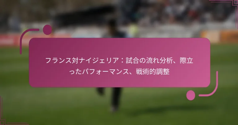 フランスとナイジェリアの試合は、戦術のダイナミックな相互作用と目立つパフォーマンスによって特徴づけられ、その結果に大きな影響を与えました。両チームは支配の時期を経験し、戦略的な調整や選手交代が試合の流れにおいて重要な役割を果たしました。重要な選手たちが卓越したプレーを見せ、試合の流れを定義する重要な瞬間を形作りました。 フランス対ナイジェリアの試合の流れはどうだったか? フランスとナイジェリアの試合の流れは、戦術のダイナミックな相互作用、目立つパフォーマンス、そして結果に影響を与えた重要な瞬間を示しました。両チームは支配の時期を示し、戦術的な調整や選手交代が試合の方向性を形作る上で重要な役割を果たしました。 試合を定義した重要な瞬間 試合の開始の笛が鳴ると、フランスはすぐにコントロールを確立し、早い段階で得点機会を作り出しました。 前半にナイジェリアが決めた重要なゴールは勢いを変え、彼らのカウンターアタックの力を示しました。 後半、フランスに与えられた物議を醸すペナルティが彼らの攻撃を再燃させました。 試合の最後の数分間は両チームからの激しいプレッシャーがあり、フランスの劇的な同点ゴールで締めくくられました。 試合を通じた勢いの変化 最初はフランスがボールを支配し、ペースをコントロールしていくつかの早いチャンスを作りました。しかし、ナイジェリアが試合に落ち着くにつれて、彼らのカウンターアタックがフランスのリズムを乱し、勢いの変化をもたらしました。 転機はナイジェリアのゴールで訪れ、これにより彼らの自信が高まり、フランスは戦略を適応させざるを得なくなりました。この変化により、ナイジェリアは中盤を支配し、長い間プレーをコントロールすることができました。 後半、フランスにペナルティが与えられた後、勢いは再び彼らに傾き、彼らは新たな活力で前進し、複数の得点機会を作り出しました。 全体の進行と出来事のタイムライン 試合はフランスが積極的にプッシュし、いくつかの早いシュートを放つことで始まりました。20分の時点で、ナイジェリアは自分たちの足場を見つけ、効果的にカウンターを仕掛け、35分に得点しました。 ハーフタイム後、フランスは戦術的な調整を行い、新たなエネルギーを攻撃に加える交代を行いました。60分に与えられたペナルティは重要な瞬間であり、フランスが同点に追いつくことを可能にしました。 試合が終わりに近づくにつれ、両チームはチャンスを交換し、フランスが最後の瞬間にネットを揺らし、スリリングなフィニッシュを迎えました。 試合の流れに対する審判の決定の影響 審判の決定は試合の流れを形作る上で重要な役割を果たし、特にフランスに与えられた物議を醸すペナルティが影響を与えました。この決定はスコアラインに影響を与えただけでなく、両チームの心理状態にも影響を及ぼしました。 試合を通じて、審判のファウルやオフサイドの判定はプレーの流れに寄与し、一部の決定は選手やファンの間にフラストレーションを引き起こしました。ナイジェリアの選手たちは特定の判定に不満を表明し、これが彼らの集中力に影響を与えた可能性があります。 最終的に、審判の決定は物議を醸すものでしたが、試合の緊張感を維持し、両チームが最後の笛が鳴るまで関与し続けることを確保する上で重要でした。 重要な転機の分析 最も重要な転機の一つはナイジェリアの最初のゴールであり、これにより勢いが変わり、フランスはアプローチを再考せざるを得なくなりました。このゴールはナイジェリアが守備の隙間を利用する効果的な方法を示しました。 フランスに与えられたペナルティも重要な瞬間であり、これにより彼らはコントロールと自信を取り戻すことができました。この決定は戦術的な状況を変え、ナイジェリアにより守備的な姿勢を取らせることになりました。 最後に、フランスの遅れた同点ゴールは、忍耐と戦術的調整の重要性を示し、ハイステークスの状況で試合の流れがどれほど迅速に変わるかを示しました。 試合での目立つパフォーマンスを見せた選手は誰か? フランスとナイジェリアの試合で目立つパフォーマンスを見せた選手たちは、試合の結果を形作る上で重要な役割を果たしました。重要な選手たちが卓越したパフォーマンスを披露し、試合を定義する重要な瞬間に影響を与えました。 トップ選手とその貢献 フランスのフォワード、キリアン・ムバッペは攻撃において重要な役割を果たし、重要なゴールを決め、アシストを提供しました。彼のスピードとドリブルは多くのチャンスを生み出し、試合を通じてナイジェリアの守備にプレッシャーをかけました。 ナイジェリアのゴールキーパー、フランシス・ウゾホは、チームを試合に留めるためのいくつかの重要なセーブを行い、素晴らしい反射神経とシュートストッピング能力を示しました。彼のパフォーマンスは、フランス