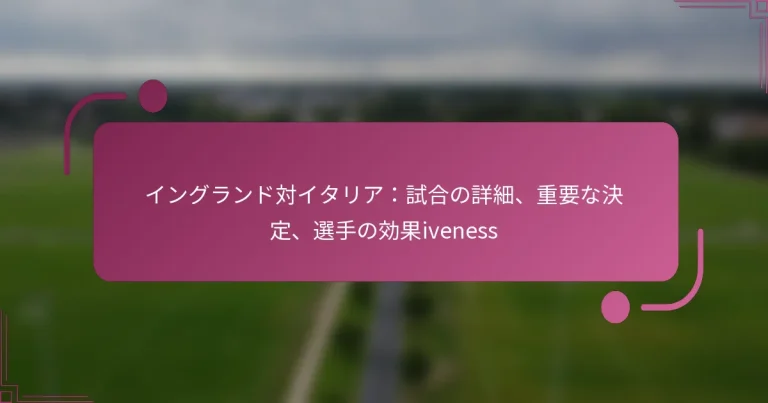 イングランド対イタリアの試合は、その結果を形作る重要な瞬間が特徴的なスリリングな対戦でした。主審の重要な決定、戦術的な動き、個々の選手の際立ったパフォーマンスが、最終スコアを決定する上で重要な役割を果たしました。この分析では、試合のダイナミクスを定義した重要な瞬間と選手の効果について掘り下げます。 イングランド対イタリアの試合での重要な瞬間は何でしたか? イングランド対イタリアの試合では、結果に大きな影響を与えた数々の重要な瞬間がありました。主審の重要な決定、影響力のあるゴール、両チームの戦術的なシフトが試合のダイナミクスと最終スコアを形作りました。 試合のスコアとタイムラインの概要 試合はイタリアが2-1で勝利し、終了しました。イングランドは早い段階でリードを奪いましたが、イタリアは迅速に反応し、彼らのレジリエンスを示しました。試合のタイムラインには、特にゴールや重要なファウルの周辺で勢いが変わる重要なフェーズが含まれていました。 分 イベント 15' イングランドが最初のゴールを決める 30' イタリアが同点に追いつく 75' イタリアが勝ち越しゴールを決める 結果に影響を与えた重要なイベント 試合の結果を決定する上で、いくつかの重要なイベントが重要な役割を果たしました。前半早々のイングランドのゴールはポジティブなトーンを設定しましたが、イタリアの迅速な同点ゴールは勢いを変えました。さらに、物議を醸すファウルが重要なフリーキックにつながり、イタリアはそれをゴールに変えました。 イングランドの早いゴールは彼らの自信を高めました。 イタリアの迅速な反応は彼らの戦術的な適応力を示しました。 イングランドの遅いファウルはイタリアにとって危険なフリーキックをもたらしました。 得点と試合への影響 この試合での得点は、スコアラインだけでなく、両チームの心理的な影響にも重要でした。イングランドの初期のゴールは選手たちに活力を与えましたが、イタリアの同点ゴールはその熱意をすぐに冷やしました。試合の終盤にイタリアが決めた勝ち越しゴールは、彼らの戦術的な優位性を確固たるものにし、イングランドは反応を求めてあたふたしました。 イングランドのゴールは、うまく実行されたコーナーキックから生まれました。 イタリアの同点ゴールは、イングランドの守備の隙を突いた結果でした。 決定的なゴールは、プレッシャーの中でのイタリアの冷静なフィニッシュを示しました。 重要なファウルと主審の決定 主審の決定は試合の流れを形作る上で重要でした。いくつかの重要なファウルがフリーキックにつながり、試合の結果を変える可能性がありました。主審のこれらのファウルの管理は、両チームの戦略に影響を与え、選手たちはカードを受けるリスクを考慮しなければなりませんでした。 イングランドのディフェンダーに疑わしいイエローカードが出されました。 イタリアは、彼らの2点目につながるフリーキックの恩恵を受けました。 相手のリズムを乱すためにいくつかの戦術的ファウルが犯されました。 コーチによる戦術的変更 両チームのコーチは、試合中に全体のプレーに影響を与える重要な戦術的調整を行いました。イングランドは最初、ボール保持に重点を置いていましたが、失点後はより攻撃的なアプローチにシフトしました。一方、イタリアはリードを奪った後、守備の構造を強化し、プレッシャーを吸収し、効果的にカウンターアタックを狙いました。 イングランドはコントロールを取り戻すためにフォワードをミッドフィールダーに交代しました。 イタリアのコーチは守備を強化するためにフォーメーションを調整しました。 両チームは試合の最後の数分でラインアップをリフレッシュするために交代を利用しました。 試合中に行われた重要な決定は何でしたか? イングランドとイタリアの試合では、試合の結果に影響を与えた数々の重要な決定がありました。主審の判定、コーチの戦略、交代が試合のダイナミクスを形作る上で重要な役割を果たし、アナリストの間でかなりの議論を引き起こしました。 ....