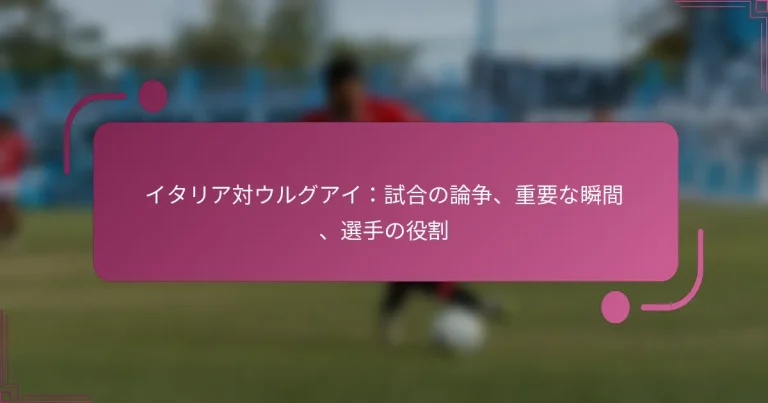 イタリアとウルグアイの試合は、論争や試合の結果に大きな影響を与える重要な瞬間が満載のスリリングな対戦でした。審判の判定、VARの介入、そして重要な選手のパフォーマンスが試合のダイナミクスを形成する上で重要な役割を果たし、フィールド上の緊張感とドラマを際立たせました。各選手の役割は重要であり、彼らの行動や戦術的アプローチが試合全体の流れと結果に影響を与えました。 イタリア対ウルグアイの試合での主な論争は何でしたか? イタリアとウルグアイの試合は、試合のダイナミクスや結果に影響を与えるいくつかの論争によって特徴づけられました。重要な審判の判定、VARの介入、そしてファンの反応が試合に対する意見を形成する上で重要な役割を果たしました。 議論を呼んだ審判の判定 審判の判定は、ハイステークスの試合ではしばしば焦点となり、この対戦も例外ではありませんでした。試合中に行われた複数の判定、特にファウルやペナルティの可能性に関する判定は、選手やファンの間で疑問を呼び起こしました。 特に注目されたのは、イタリアの選手に対して出された疑わしいイエローカードで、多くの人が不当だと考えていました。この判定は、試合中の審判の一貫性について議論を呼び起こし、解説者やアナリストの間で熱い議論が交わされました。 さらに、ウルグアイのディフェンダーによる遅れたチャレンジが無罰となり、イタリア側からの激しい反発を引き起こしました。このような瞬間は、選手の士気に影響を与えるだけでなく、試合全体の雰囲気にも影響を及ぼしました。 VARの介入とその影響 VAR技術は試合において重要な役割を果たし、いくつかの重要な瞬間がレビューされました。VARは公正さを高めるために設計されていますが、その実施はファンや選手の間で複雑な感情を引き起こすことがあります。 この試合では、ハンドボールの可能性がレビューされましたが、審判の元の判定を支持する決定が下されたことで、多くの観客が不満を抱きました。批評家は、VARプロセスが長すぎて透明性に欠けると主張し、試合の興奮を損なう結果となりました。 さらに、VARの介入のタイミングはプレーの流れをしばしば中断させ、さらなる不満を引き起こしました。ファンは、そのような遅延が試合中に見られるスキルや戦略を覆い隠す可能性があることを懸念しました。 ファンとアナリストの意見が分かれた出来事 試合中のいくつかの出来事は、ファンやアナリストの間で意見の分裂を引き起こし、試合の出来事に対する異なる視点を浮き彫りにしました。審判の判定の論争的な性質は、ソーシャルメディアプラットフォームでの意見の対立を引き起こしました。 一部のファンは、審判の判定が試合のルールの範囲内であると擁護しましたが、他のファンは審判の偏見を激しく批判しました。この分裂は、試合後の議論においても明らかで、アナリストたちは判定とその影響を分析しました。 さらに、論争のある瞬間に対する選手の反応は議論を呼び起こし、一部はそれをスポーツマンシップに反する行為と見なしました。このような出来事は、試合の誠実性に影響を与えるだけでなく、サッカーにおけるスポーツマンシップについてのより広範な議論を引き起こしました。 論争のある瞬間が試合結果に与えた影響 試合中の論争は結果に具体的な影響を与え、両チームのパフォーマンスに影響を及ぼしました。論争のある判定の心理的影響は勢いの変化を引き起こすことがあり、この試合も例外ではありませんでした。 イタリアは審判の判定に不満を抱き、冷静さを保つのに苦労し、攻撃戦略に影響を与えました。一方、ウルグアイはこの状況を利用し、論争のある雰囲気の中で自信を高めました。 最終的に、試合結果は多くの人にとってこれらの論争の反映と見なされ、試合終了後も公正さや審判についての議論が続きました。 両チーム間の論争の歴史的背景 イタリアとウルグアイのライバル関係は歴史に根ざしており、過去の対戦はしばしば論争や物議を醸す瞬間によって傷つけられています。この試合は、彼らの歴史あるライバル関係に新たな章を加え、同様の論争を特徴とする以前の対戦を反映しました。 歴史的に、両チームは重要なトーナメントで対戦しており、各試合はしばしば高い緊張感と激しい競争によって特徴づけられています。過去の出来事、例えば論争のあるゴールや赤カードは、彼らの対戦の論争的な性質の前例を設定しています。 このように、この試合は単なるスポーツイベントではなく、ドラマとライバル関係に満ちた物語の続きとして機能し、ファンや選手の情熱をさらに燃え上がらせました。 イタリア対ウルグアイの試合を定義した重要な瞬間は何でしたか? イタリアとウルグアイの試合は、結果を形作るいくつかの重要な瞬間によって特徴づけられました。重要なゴール、論争のある審判の判定、そして重要な選手の行動が試合の緊張感と