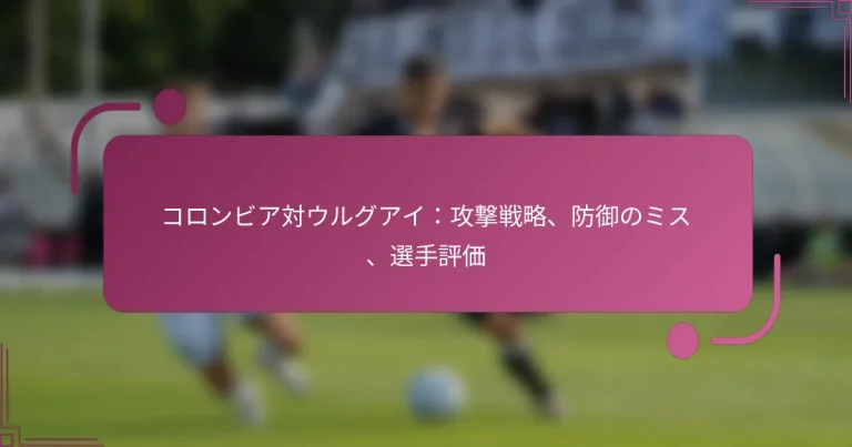 コロンビアとウルグアイの対戦は、攻撃戦略の対照を示しました。コロンビアは4-2-3-1フォーメーションでウィングプレーを重視し、ウルグアイは4-4-2のセットアップからカウンターアタックに依存しました。両チームは結果に影響を与える重要な守備のミスを犯し、それぞれが相手の脆弱性を突くことができました。試合の選手評価は、個々の貢献とチームのゲームプランを実行する上での各選手の全体的な効果を強調しています。 コロンビアとウルグアイの攻撃戦略は何ですか? コロンビアとウルグアイは、それぞれのフォーメーションとキープレーヤーを反映した異なる攻撃戦略を利用しています。コロンビアはしばしば4-2-3-1フォーメーションを採用し、ウィングプレーと迅速なトランジションに焦点を当てています。一方、ウルグアイの4-4-2セットアップはカウンターアタックとセットプレーを強調しています。 試合でのコロンビアの主要フォーメーション コロンビアの試合での主なフォーメーションは4-2-3-1で、攻撃と守備の両方で柔軟性を持たせています。このセットアップは、2人のホールディングミッドフィールダーがバックラインをサポートし、攻撃のトリオが相手の守備のスペースを利用できるようにしています。 このフォーメーションの設計は、守備から攻撃への迅速なトランジションを促進し、ウィングプレーヤーのスピードを活用します。このアプローチは、効果的なウィングプレーを生み出し、ボックス内へのクロスの機会を作り出すことがよくあります。 試合でのウルグアイの主要フォーメーション ウルグアイは4-4-2フォーメーションを利用し、守備と攻撃のバランスが取れています。このセットアップでは、2人のストライカーが相手の守備をプレッシャーし、ミッドフィールダーがサポートとカバーを提供します。 4-4-2フォーメーションはカウンターアタックに特に効果的で、迅速なトランジションと守備のミスを利用する能力を持っています。ウルグアイの構造はまた、セットプレーを強調し、しばしば高さとフィジカリティを活かして得点を狙います。 コロンビアの注目すべき攻撃選手 デュバン・サパタはコロンビアの重要な攻撃選手として浮上し、彼の強さとプレーを保持する能力で知られています。彼のボックス内での存在は、特にセットプレーの際に得点機会を生み出します。 さらに、ルイス・ディアスやフアン・クアドラードのような選手は、ウィングでのスピードと創造性を提供し、コロンビアが相手を引き伸ばし、中央の攻撃者にチャンスを作ることを可能にします。 ウルグアイの注目すべき攻撃選手 ウルグアイの攻撃は、ルイス・スアレスによって大いに強化されており、彼の経験とフィニッシング能力は常に脅威となります。彼のポジショニングと動きはチームメイトにスペースを作り出し、全体的な攻撃戦略を向上させます。 もう一人の注目すべき選手はエディンソン・カバーニで、彼はスアレスと良いコンビを組み、作業率と空中戦の強さで補完し合っています。彼らは一緒に守備の脆弱性を突くことができる強力なパートナーシップを形成しています。 コロンビアが採用した成功したプレーと戦術 コロンビアの成功した戦術は、効果的なウィングプレーにしばしば依存し、ウィンガーのスピードを活用してボックス内へのクロスを供給します。このアプローチは、特にセットプレーから多くの得点機会を生み出しました。 カウンターアタックも重要な戦術であり、コロンビアは守備から攻撃に迅速に移行し、相手を不意を突くことができます。この戦略は、守備のミスを利用できる試合で効果的であることが証明されています。 ウルグアイが採用した成功したプレーと戦術 ウルグアイはカウンターアタックのサッカーに優れ、迅速なトランジションを利用して相手のミスを突くことがよくあります。この戦術は、ストライカーのスピードとフィニッシングスキルを効果的に活用することを可能にします。 さらに、セットプレーはウルグアイの攻撃戦略において重要な役割を果たします。彼らはコーナーキックやフリーキックから頻繁に得点し、空中戦を支配して得点機会を作り出します。 試合中にどのような守備のミスが発生しましたか? コロンビアとウルグアイの両チームは、試合に大きな影響を与える重要な守備のミスを示しました。コロンビアの守備の隙間をウルグアイが突く一方で、ウルグアイのミスはコロンビアが得点機会を活かすチャンスを逃す結果となりました。 コロンビアが犯した守備のミス コロンビアの守備はポジショニングに苦しみ、特にセットプレーの際に問題がありました。選手たちはしばしば相手をきちんとマークできず、ウルグアイにいくつかの明確な得点機会を与えました。さらに、守備陣の間のコミュニケーション不足がボールクリアの不協和音を引き起こし、ウルグアイがプレッシャーを維持することを許しました。 もう一つの注目