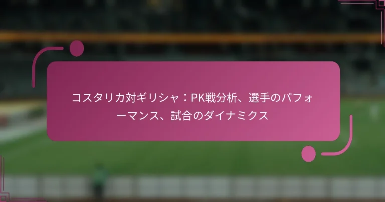 コスタリカ対ギリシャの試合は、両チームのレジリエンスとスキルを示す劇的なPK戦で締めくくられました。重要な瞬間や個々のパフォーマンスが試合のダイナミクスを形成し、この緊迫した対戦の結果に影響を与えました。 コスタリカ対ギリシャの試合での重要な瞬間は何でしたか? コスタリカ対ギリシャの試合は、緊迫したPK戦に至るいくつかの重要な瞬間によって特徴づけられました。両チームはレジリエンスとスキルを示しましたが、試合の結果を形作ったのは重要なプレーと決定でした。 試合のタイムラインの概要 試合は両チームが慎重に相手の守備を試す形で始まりました。コスタリカが早い段階でリードを奪い、攻撃力を示しましたが、ギリシャはすぐに同点に追いつき、接戦の舞台を整えました。試合が進むにつれて、両チームは得点のチャンスを持ちましたが、強力な守備が得点を許さず、延長戦に突入しました。 延長戦では、両チームが決定的なゴールを目指して激しく攻め合い、緊張感が高まりました。しかし、どちらも決定打を打てず、勝者を決定するための劇的なPK戦に突入しました。 PK戦に至る重要なプレー 試合を特徴づけた重要なプレーには、コスタリカのゴールキーパーによるギリシャの潜在的な勝利ゴールを阻止する重要なセーブが含まれました。この瞬間は同点を維持するだけでなく、コスタリカの選手たちの士気を高めました。さらに、ギリシャが規定時間中に外したPKは転機となり、試合を同点に保ち、コスタリカが再編成する機会を与えました。 試合が進む中で、両チームは得点のチャンスを持ちましたが、両サイドの強力な守備プレーとミスが影響し、スコアは1-1のままでした。これらの重要なプレーの集大成がPK戦の舞台を整え、神経とスキルが勝者を決定することとなりました。 決定的な審判の判断とその影響 審判の判断は試合において重要な役割を果たし、特にファウルの判定や選手の行動管理において顕著でした。コスタリカの重要な選手に対して出された物議を醸すイエローカードは緊張を高め、ファンやアナリストの間で議論を呼びました。この決定はコスタリカの守備戦略に影響を与え、さらなる警告を避けるために慎重になる必要がありました。 さらに、ギリシャに与えられたPKの扱いは議論の焦点となりました。ファウルがボックス内で発生したかどうかについて多くの意見があり、この不確実性が試合のドラマを増しました。このような決定は、チームの士気や試合のダイナミクスに持続的な影響を与えることがあり、この対戦でもそれが見られました。 重要な瞬間におけるファンの反応 ファンは試合を通じて非常に熱心で、重要な瞬間には感情が高まりました。コスタリカの早いゴールは支持者の間で盛大な祝賀を引き起こし、ギリシャの同点ゴールはファンからの安堵のため息をもたらしました。スタジアムの雰囲気は電気のようで、試合が進むにつれてチャントや歓声が響き渡りました。 PK戦中、緊張は最高潮に達し、ファンは各選手がシュートを打つたびに息を呑みました。反応は喜びから絶望まで様々で、その瞬間の高い賭けを反映していました。この感情のジェットコースターは、サポーターの情熱と両国にとっての試合の重要性を際立たせました。 試合後の分析とコメント 試合後、アナリストたちは両チームのパフォーマンスを称賛し、コスタリカの戦術的な規律とギリシャの闘志を強調しました。PK戦は、高レベルの競技において必要とされる精神的な強さを示し、コスタリカが最終的に勝利を収めました。解説者たちは、こうした高圧の状況における準備と冷静さの重要性を指摘しました。 試合後の議論は、両チームの今後の展望にも焦点を当てました。コスタリカの勝利は、国際サッカーにおける成長の証と見なされ、ギリシャのパフォーマンスは得点機会を生かす能力に疑問を投げかけました。全体として、この試合はノックアウトサッカーのスリリングな例となり、ファンは今後の対戦を楽しみにしました。 PK戦はどのように展開されましたか? コスタリカとギリシャのPK戦は、試合の結果を決定づける緊迫した重要な瞬間でした。両チームは素晴らしいスキルと冷静さを示しましたが、最終的には個々の選手とゴールキーパーのパフォーマンスがすべての違いを生み出しました。 PK戦のステップバイステップの内訳 PK戦はコスタリカが最初のPKを決めることで始まり、シリーズのトーンを設定しました。各チームは交互にキックを行い、選手たちは大きなプレッシャーの中でシュートを打ちました。このシーケンスは、すべての指定されたシュートが終わるまで続き、最終的なスコアはチームがストレスを処理し、プレッシャーの中で実行する能力を反映しました。 PK戦中、雰囲気は電気のようで、ファンは各選手がスポットに近づくたびに息を呑みました。心理的な側面が重要な役割を果たし、選手たちは観客の騒音と期待の中で集中しなけ